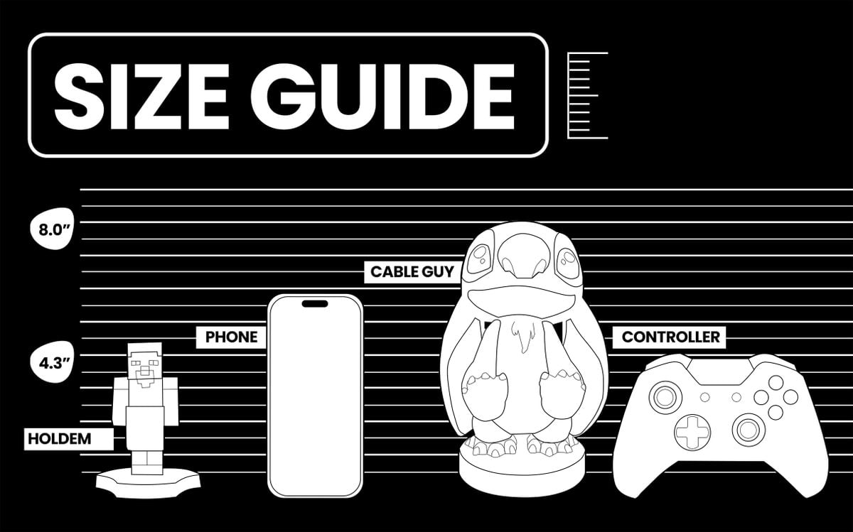 Whether you’re after a classic Cable Guy to hold your controller or phone, or a compact Cable Guy Mini for smaller devices, you’ll find all the essential sizing details here.